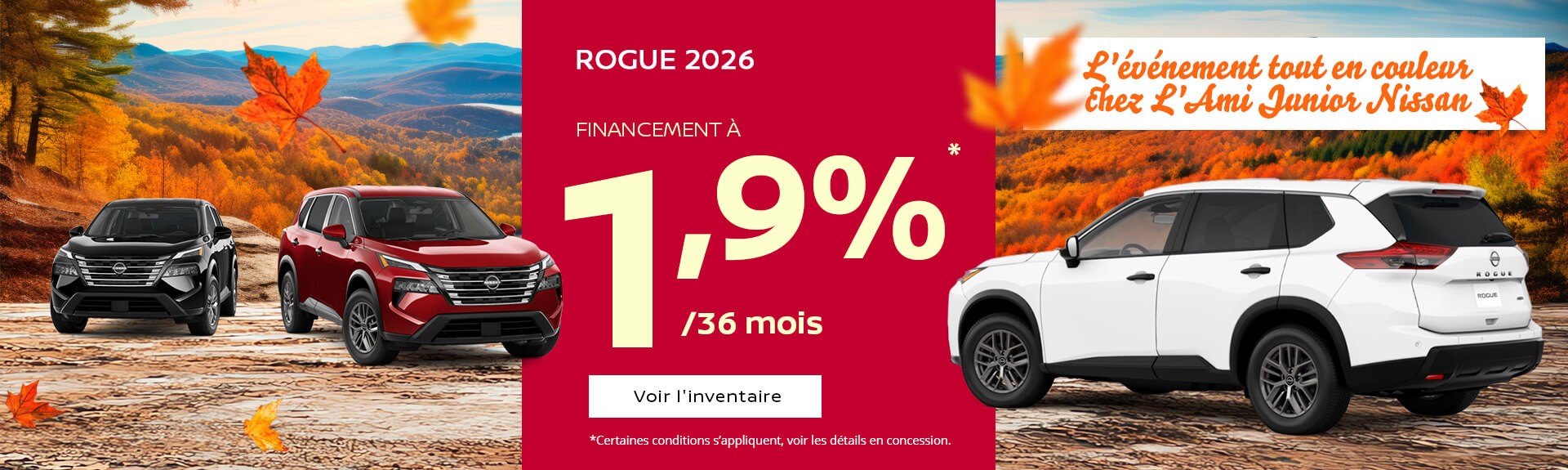Combinez style, maniabilité et praticité avec le Nissan Kicks d’occasion ou découvrez l’espace confortable et le roulement tout en douceur d’un Nissan Rogue usagé.