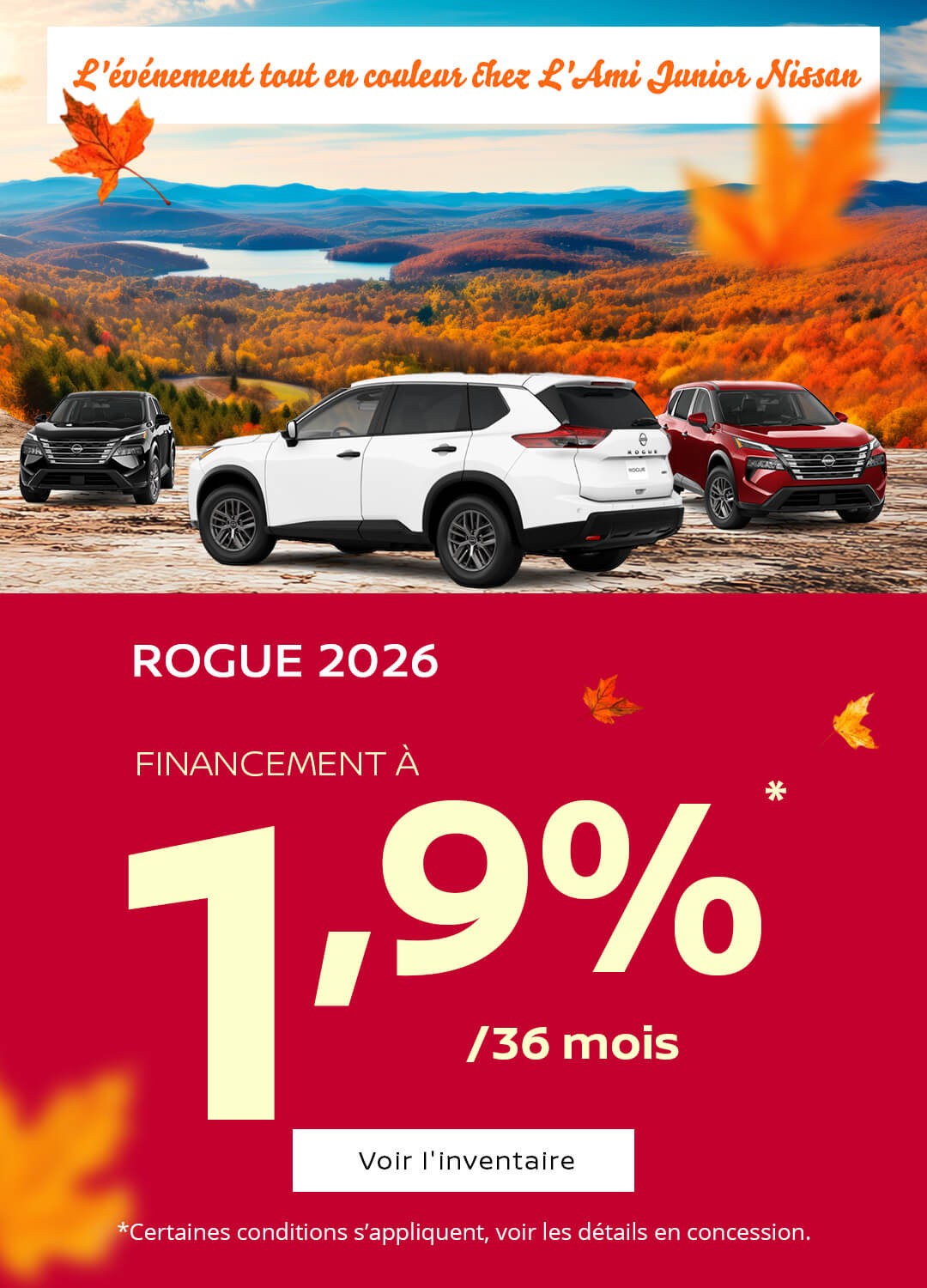 Notre concessionnaire Nissan va plus loin qu’un inventaire complet de véhicules neufs et d’occasion. Nous poursuivons notre engagement envers votre satisfaction longtemps après l’achat avec un service après-vente à la hauteur de votre véhicule.Vous pourrez également découvrir nos Mazda d'occasion ou encore nos Toyota usagées à vendre.